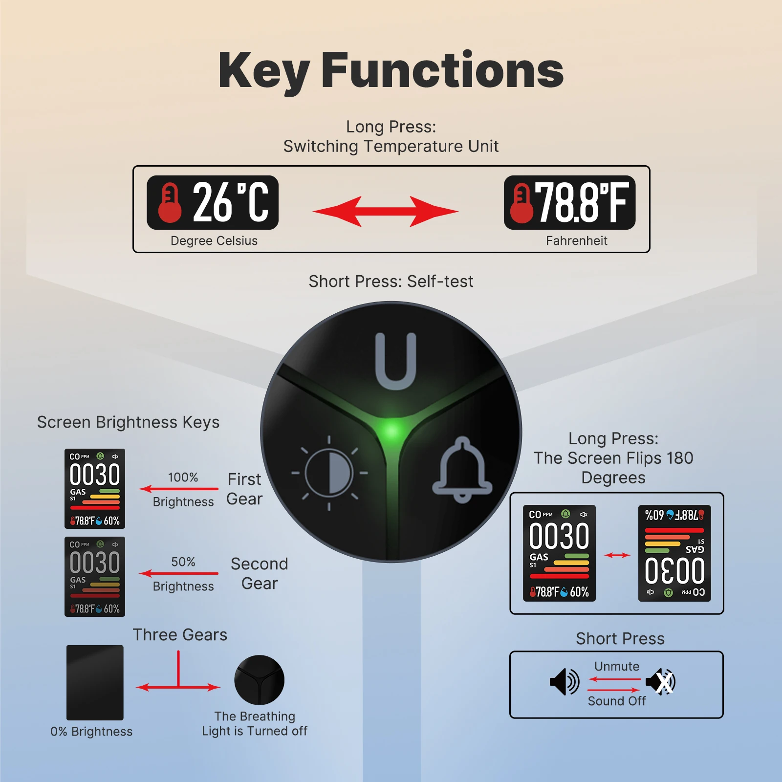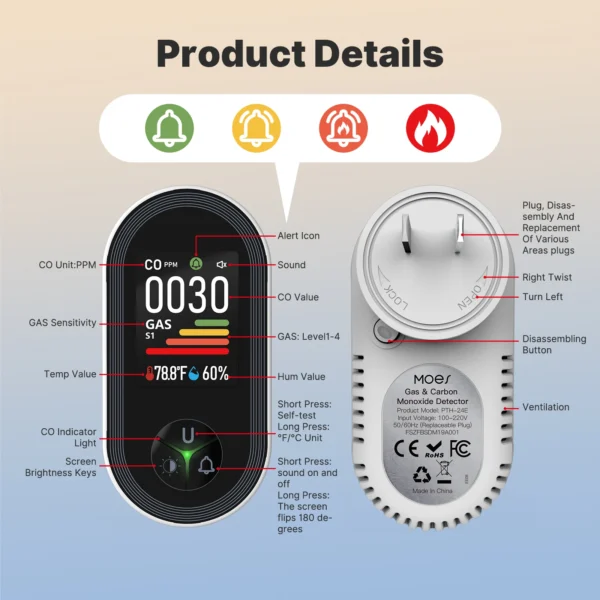 Clear digital display with intuitive buttons for temperature unit switching, screen rotation, and brightness adjustment. Compact plug design for easy wall outlet installation, plus vents and indicators for reliable CO and conbustible detection and alerts.