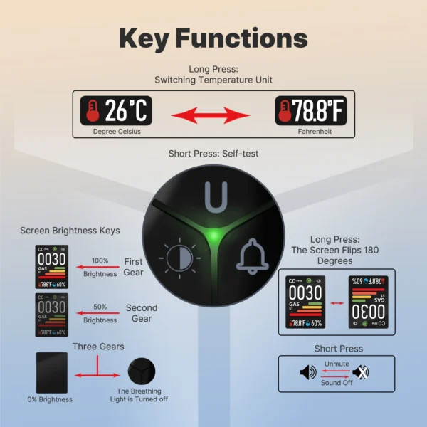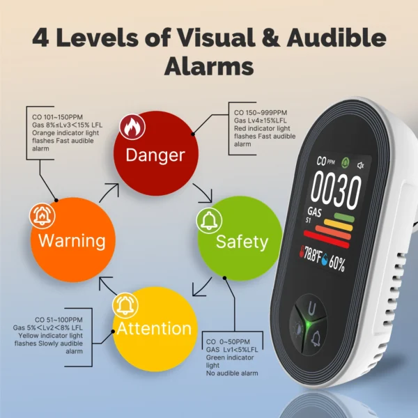 With four distinct alarm levels, this detector uses visual LED indicators and audible warnings to keep you fully informed of rising CO and conbustible gas concentrations—ensuring you stay ahead of potential hazards.